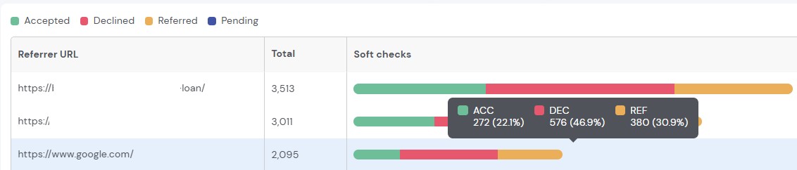 In the screenshot below we can see that Google organic traffic was the third highest referral source for the credit union. There were 3,011 visits 1,228 converting to soft checks (41% conversion). Those soft checks led to twice as many declines as accepts. This finding is an opportunity to sharpen messaging to improve the acceptance rate ahead of any paid campaign: